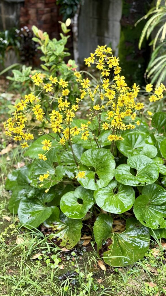 黄色いツワブキの花も